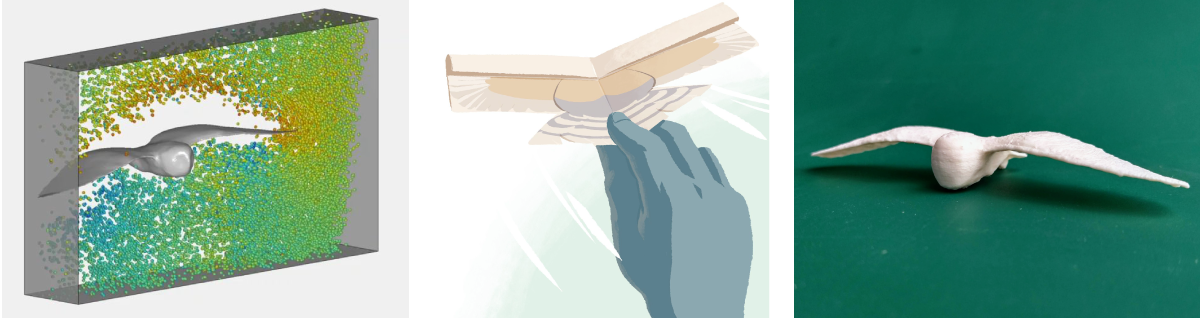 We built a prototype glider and flew it through the same gusty conditions. It was very important to give it the proper physical characteristics; not feathers, but specially designed hinging wings: